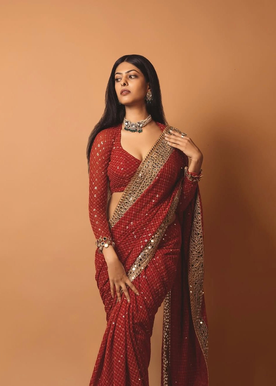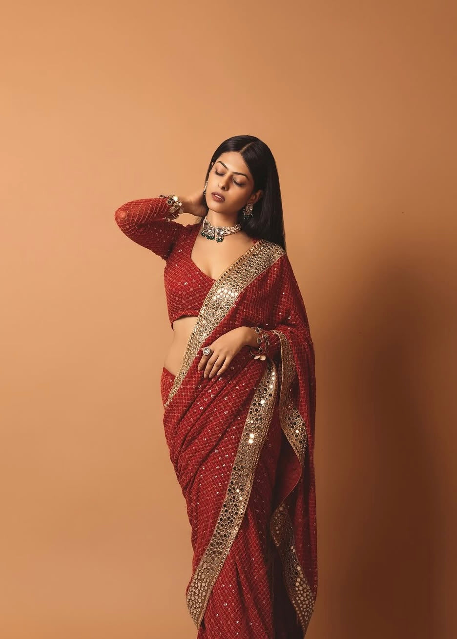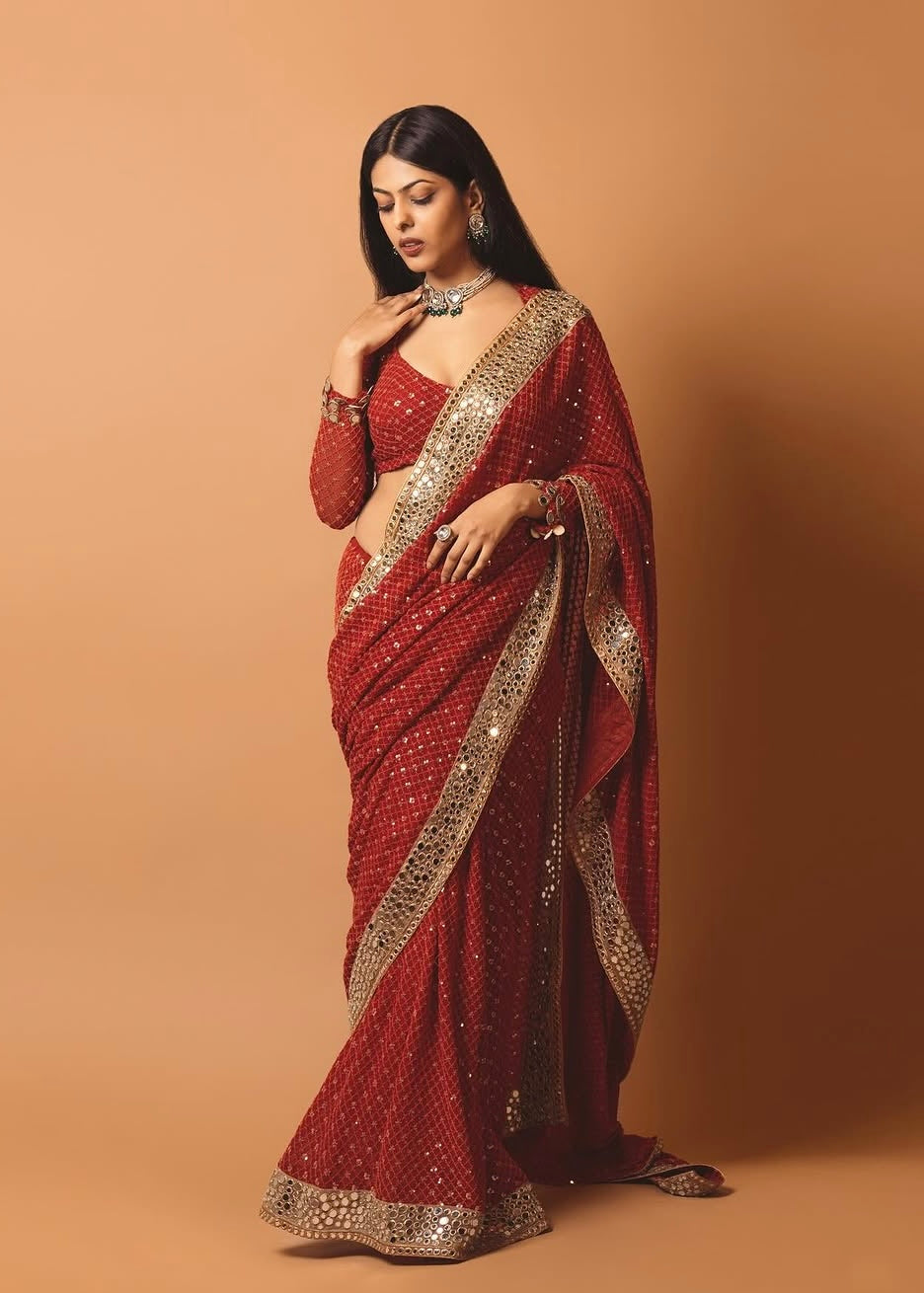 Exude elegance and timeless glamour with this exquisite red saree, as seen on Ananya Pandey. This saree is crafted with intricate detailing, featuring shimmering mirror work that accentuates its rich, bold red color. Perfect for weddings, festive celebrations, and special occasions.